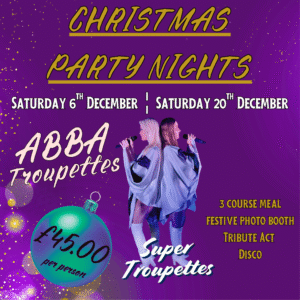 This Christmas, step into a glittering world of sequins, sparkle, and sensational sounds with our ABBA Christmas Party Night, headlined by the fabulous Super Troupettes – the ultimate ABBA tribute act!