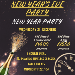 - Dinner & Party Package: Start your evening with a delicious three-course home-cooked meal, featuring festive starters, indulgent mains, and decadent desserts. Then join the party as the DJ takes over and the countdown begins!